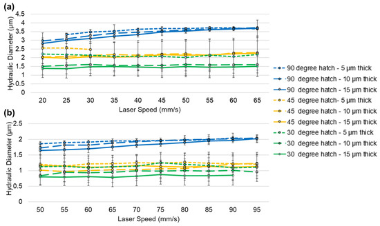 Line plots of the hydraulic diameter of membranes fabricated at different laser speeds for samples with (a) 5 µm hatching pitches and (b) 3 µm hatching pitches. These results are shown for samples fabricated at different hatching angles (90°, 45°, and 30°) and varied designed membrane thicknesses (5 µm, 10 µm, and 15 µm). Standard deviation error bars are included to illustrate the variability in pore sizes across different angles and pitches.