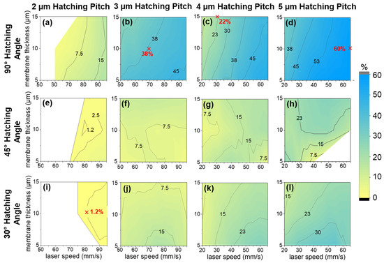 Figure 12 illustrates the membrane porosity of the membranes by utilizing contour plots delineated by fabricated membrane thickness and laser printing speed for samples fabricated at 100% laser power for different hatching pitch and angles. Generally, porosity decreases with hatching pitch and hatching angle.