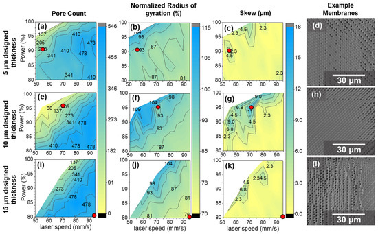 Contour plots illustrating the (a,e,i) pore count, (b,f,j) normalized radius of gyration, and (c,g,k) skew for membranes fabricated with 2 µm hatching pitches and 45° hatching angles. The membranes are categorized by designed thickness: (a–c) 5 µm, with red dots noting the source of the membrane shown in (d); (e–g) 10 µm, with red dots noting the source of the membrane shown in (h); and (i–k) 15 µm, with red dots noting the source of the membrane shown in (l). Additionally, SEM images of example membranes from the dataset are provided: fabricated with (d) a thickness of 5 µm at 90% power and 55 mm/s speed, (h) a thickness of 10 µm at 95% power and 70 mm/s speed, and (l) a thickness of 15 µm fabricated at 80% power and 95 mm/s speed.