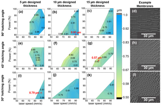 Contour plots depicting the average pore hydraulic diameters across printing power and speed of membranes that passed the selection criteria. These membranes were fabricated with 2 µm hatching pitches and designed thicknesses of (a,e,i) 5 µm, (b,f,j) 10 µm, and (c,g,k) 15 µm, with hatching angles of (a–c) 90°, (e–g) 45°, and (i–k) 30°. SEM images of example membranes from the dataset are also shown that are fabricated with (d) a 90° hatching angle, 10 µm designed thickness, 80% power, and 90 mm/s speed; (h) a 45° hatching angle, 10 µm designed thickness, 85% power, and 70 mm/s speed; and (l) a 30° hatching angle, 5 µm designed thickness, 85% power, and 90 mm/s laser speed. The locations of the membranes in (d), (h), and (l) are marked with red crosses and labeled with their diameter values in the plots of (b), (g), and (i), respectively.
