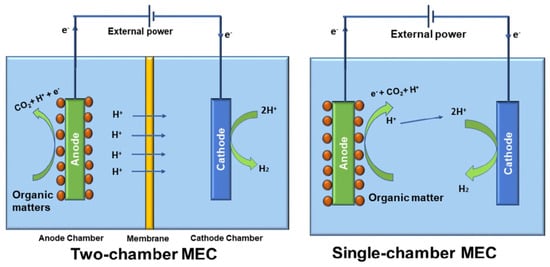 The microbial electrolysis cell (MEC) is an emerging bioelectrochemical system (BES) that employs an electrochemical process facilitated by a biological catalyst to produce energy from various substrates [131,132]. Microbial fuel cells represent an improved iteration of MEs and the advanced version of MFCs, in which microorganisms are used to break down organic substrates [132,133,134]. They closely resemble modern-day batteries, featuring anodes and cathodes [134]. There are single- and double-chambered MECs for producing H2 from a wide range of substrates (Figure 5). Nonetheless, single-chambered membrane-less MECs are more cost-effective for attaining high H2 production rates [135,136]. Tartakovsky et al. reported a fivefold increase in H2 production set up in a continuous flow membrane-less MEC [131].