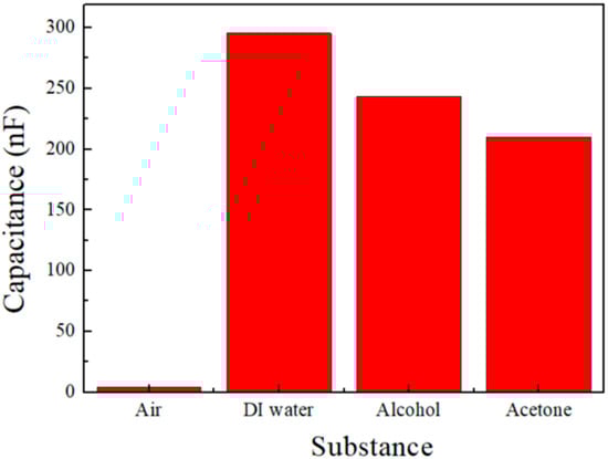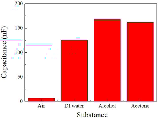 In the capacitance measurements of different substances, we dropped the test liquids onto the area using a sputtered Pt electrode. The porous property of AAO made it easy for the test substances to enter the pores and promoted the differences in the electrical properties. The measurement results for AAO prepared through HPA at 40/−2 V for 2 h are shown in Figure 3, with each substance measured three times and averaged. The measured capacitance values for air, DI water, alcohol, and acetone were 6.6 nF, 125.4 nF, 167.9 nF, and 162.2 nF, respectively. Since the AAO liquid-phase sensor was an MDM structure and could be regarded as a parallel capacitor, the measurements followed Equation (1) below: