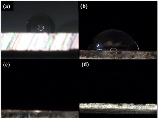 Figure 6 illustrates the contact angle measurements of AAO before and after pore widening, as well as with different test substances. In Figure 6a, the AAO sample was anodized at 40/−2 V for 2 h and coated with 10 nm of platinum. In Figure 6b, the AAO underwent pore widening treatment in 5 wt% phosphoric acid at 35 °C for 20 min before being coated with 10 nm of platinum. Through the ImageJ software analysis, the contact angles were measured three times and averaged, resulting in values of 93.2° and 67.7° for Figure 6a,b, respectively. This experiment demonstrates that after pore widening, the contact angle of the AAO nanostructure decreased, indicating an increase in hydrophilicity. The smaller contact angle also explains why more DI water was able to occupy the pores, leading to a greater contribution to the capacitance value. Consequently, DI water, with the highest dielectric constant, conforms to this trend by showing the highest measured capacitance value. Figure 6c,d show the contact angle measurement results for the non-pore-widened AAO liquid-phase sensor with alcohol and acetone. No liquid images can be observed in the figures because alcohol and acetone fully enter the AAO pores, resulting in a contact angle close to 0°. This phenomenon was also reported by Redón et al. [45], indicating that the liquid wetted the nanostructured layer, and substances such as ethyl acetate and hexane exhibited similar behavior. The same result was observed in the pore-widened AAO samples, indicating that while pore widening modified the surface properties to allow DI water to enter the pores more effectively, it did not affect the behavior of alcohol and acetone. The effect of nanostructures on surface hydrophilicity has been investigated by multiple research teams [46,47,48]. This phenomenon can be explained according to the surface tension of liquid and divided into three components: anti-wetting pressure (Pa), effective water hammer pressure (Pewh), and wetting pressure (Pw) [48]. Among these, Pa is generated by capillary forces and prevents liquids from occupying the nanopore structures. Pa is proportional to the surface tension, meaning that the Pa value of DI water is much higher than that of alcohol and acetone, which is why a noticeable contact angle is observed in Figure 6a. Pewh and Pw are the pressures caused by the impact of liquid droplets on the surface and the kinetic energy of the droplets, respectively. Since the conditions for measuring the contact angle are consistent, Pewh and Pw are only affected by the density of the test liquid. On the other hand, according to research from Yong et al. [48], an increase in porosity effectively reduces Pa, thereby enhancing the surface hydrophilicity, as shown in Figure 6b. If the anti-wetting pressure is larger than Pewh and Pw, an anti-wetting state is observed. Conversely, if Pa is smaller than Pewh and Pw, a contact angle is difficult to observe. As a result, for liquids like alcohol and acetone with less pronounced surface tension, no significant contact angle can be observed on the surface (Figure 6c,d).