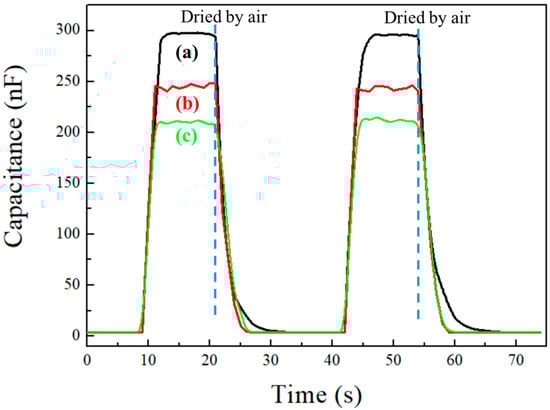 The reproducibility and the response–recovery time are also important issues for sensor performance. Figure 7 shows the re-measurement results for the AAO liquid-phase sensor after pore widening following two months of storage. The black line (a), the red line (b), and the green line (c) represent the response–recovery time diagrams for the measurements with DI water, alcohol, and acetone, respectively. The capacitance measured in air decreased from 3.8 nF to approximately 3.6 nF, mainly due to humidity variations on the measurement day. Meanwhile, the stable capacitance values for DI water, alcohol, and acetone were measured at 298.0 nF, 245.2 nF, and 213.0 nF, respectively, which were very close to the values measured two months earlier. This stability is attributed to the stability of AAO and platinum. For the DI water measurements, the response time was approximately 4 s, while the recovery time required was 10–11 s. On the other hand, in the alcohol and acetone measurements, the response time was only 2–3 s, and the recovery time was about 5–6 s. This difference is mainly due to the higher anti-wetting pressure of DI water, which causes a longer stabilization time for droplets making contact with the sensor to maintain a steady state. In contrast, ethanol and acetone diffuse into the pores quickly, resulting in shorter response times. Furthermore, even when the liquids were blown off the sensor’s surface with air, the recovery times for all three substances were generally longer than their response times. This is because evaporation requires time for the liquids to leave the surface. Among these, ethanol and acetone, due to their good volatility, exhibited shorter recovery times. The above results enable effective discrimination of the electrical signals for different liquid substances, facilitating the rapid identification of organic solvent types.