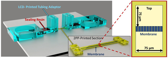 The 2PP-printed membranes allow fluid passage in the vertical direction through the membrane, which facilitates cross-flow filtration. To support this functionality, the microfluidic system design included two parallel channels, each 3.05 mm in length, as depicted in Figure 2. The 3 mm long membrane was centrally printed within the channel configuration, with one channel positioned below the membrane and the other above it.