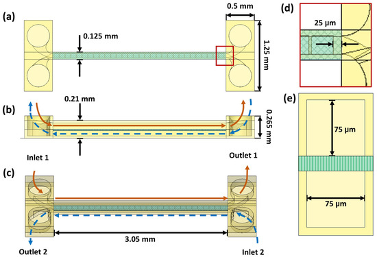 CAD renderings of the microchannel and membrane design. The structure of the microchannels is shown as transparent yellow, while the membrane is shown in teal (a,d) with hatching for top–down, (b,e) with vertical lines in the side profile, and (c) with both hatching and vertical lines in the isometric view. (b,c) have arrows designating desired flow through the channel where orange highlights the top channel, and blue shows the bottom channel. (d) shows a close-up of the boxed in area in (a) to highlight the 25 m solid wall present on either side of the channel and (e) shows the channel cross-section.