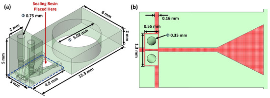 CAD file images of the LCD adaptor components of the microfluidic system from (a) an isometric view of the entire component and (b) a bottom–up view of the sealing section denoted in (a) by a blue-dashed-line rectangle. The red arrow in (a) is pointing to where the location resin is inserted for the assembly process and in (b) the hatched red area highlights the space that resin fills during the sealing process.