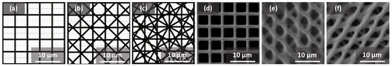 Images of the (a–c) slicing path as planned in the DeScribe version 2.5.3 and (d–f) SEM images of the printed membranes resulting from these paths with a hatching pitch of 5 m and hatching angles of (a,d) 90°, (b,e) 45°, and (c,f) 30°. These highlight the variety of membrane geometry that can be included with the current method.