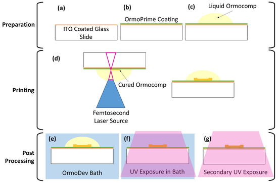 Process diagram for 2PP printing with Ormocomp showing the preparation, printing, and post-processing steps grouped. (a–c) shows the preparation of the (a) ITO-coated glass slide with (a) Ormoprime, followed by application of liquid (c), Ormocomp. (d) shows that the 2PP component is printing. (e–g) shows the post-processing steps of the fabrication method. First, (e) is a 2.5 h bath in OrmoDev, followed by (f), an in-bath flood exposure step, and (g) is a secondary exposure while the OrmoDev is evaporating from the print.