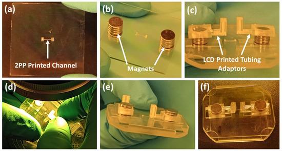 Upon completing the 2PP and LCD printing of the microfluidic chip, assembly begins. Figure 7 illustrates the alignment steps for combining the printed components. The process begins with the 2PP printed component on a glass slide (Figure 7a). Neodymium magnets with a 5 mm diameter and 0.9 mm thickness are positioned at either end of the channel. The magnets act as passive guides, allowing for easier manual alignment of features across the two print types. The magnets remain in place throughout the sealing process but do not contribute any clamping or mechanical force. Their purpose is purely positional, assisting with consistent and repeatable component placement. One magnet is placed beneath the slide on the non-component side, while four magnets are stacked on top to hold the system in place (Figure 7b). The glass slide and magnets are placed into a custom LCD-printed alignment tray, and the LCD-printed channel components are positioned onto the alignment magnets as shown in Figure 7c. Manual adjustments are made to align each LCD component with its corresponding 2PP interface (Figure 7d). Alignment of the system can be carried out under a microscope if additional visual precision is needed, but a 0.05 mm tolerance between the 2PP and LCD component interfaces facilitates manual alignment, allowing for precise fitting with minimal resistance. When properly aligned, the LCD component is flush with the surface of the glass slide, as shown in Figure 7e. Once both LCD-printed components are aligned (Figure 7f), the system is ready for compression and resin sealing.