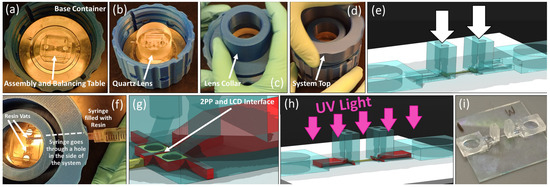 Compression and sealing procedure for bonding the 2PP and LCD components. (a–e) illustrate the mechanical compression setup: the aligned chip is placed on a metal base with a support frame and quartz lens (b) held in place by a threaded collar (c,d) to apply uniform pressure (e). (f,g) Ormocomp resin is injected into side reservoirs and allowed to flow around the interface for 5 min. (h) Flood UV exposure cures the resin, and (i) the chip is fully sealed and prepared for fluidic testing.