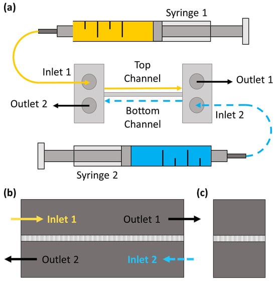 To evaluate the performance of the microfluidic chip, fluidic testing was conducted using a BASi Baby Bee Syringe Drive (BASi Research Products, West Lafayette, IN, USA) with two 2.25 mL glass syringes mounted on the pump. The use of these different volume syringes with the BASi pump requires calibration via a gravimetric analysis described below. Flow rates tested ranged from approximately 35 L/min to 345 L/min. The schematic diagram for the cross-flow testing setup is shown in Figure 9a with a lengthwise cross-sectional diagram of the chip’s internal structure for cross-flow filtration shown in Figure 9b.