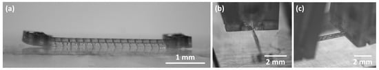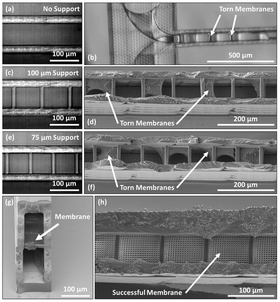 During preliminary testing, membranes were visible during the 2PP printing phase (Figure 10a). However, it was determined that membranes were tearing away from the edges of the microchannels as the developer evaporated, as shown in Figure 10b. Although 10 m wide support beams were added to the channel structure with 100 m and 75 m spacing to investigate the level of support needed to secure the membrane in place, even with the addition of support structures, membrane tearing persisted. This is shown in Figure 10d,f where the support structures slowed the tearing and deformation but did not fully prevent it. Further observation revealed that tearing was primarily occurring at the fluid–air interface during evaporation after the developer bath.
