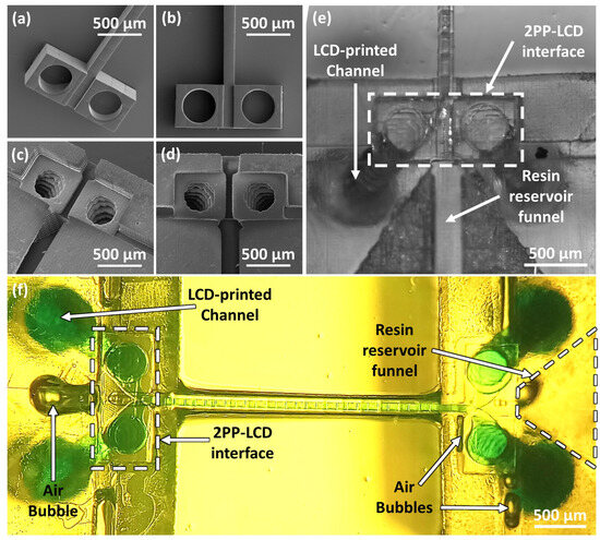 Figure 12f shows the completed resin seal, which not only effectively seals the channel, preventing potential fluid leakage, but also provides additional structural stability. Additionally, in Figure 12f, arrows highlight bubbles formed during the resin sealing process when displaced air escapes through the resin vat or becomes trapped in smaller areas. These bubbles are not a concern because the outside air does not connect to the 2PP-LCD interface and no leakage is observed.