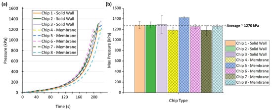 Pressure testing was conducted on eight microfluidic chips to evaluate the structural robustness of the fabricated devices. Each chip was tested in triplicate to assess performance consistency. As shown in Figure 13a, steady input flow rates produced an exponential increase in pressure over time, which was ultimately limited by the mechanical capacity of the syringe pump. Maximum recorded pressures for each test are summarized in Figure 13b.