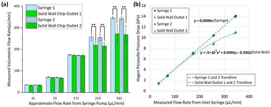 Flow characterization of solid wall chips. (a) A bar chart of the flow rates measured for inlet to and outlet from the solid wall channel chip grouped by approximate inlet flow rate and the channel measured from (** p < 0.01), and (b) a scatter plot with linear trend lines of the Hagen–Poiseuille calculated pressure drop from this dataset.