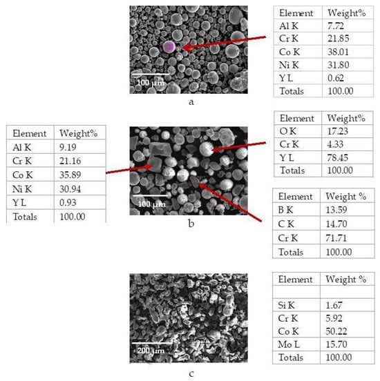 The CoNi alloy powder particle shape is essentially spherical with two distinct size distributions one in the range of 4–5 μm and 20–25 μm, respectively (Figure 1a). EDS analysis confirmed a homogeneous powder consisting of Co, Ni, Cr, Al, and Y as expected. In contrast, the CoNi cermet powder comprises both spherical and angular grains mixed together (Figure 1b). The spherical porous particles are identified as Y2O3, while the angular particles, characterized by their rough surfaces, are associated with CoNiCrAlY. The dense particles with flat, glossy surfaces correspond to CrC and CrB2, based on EDS analysis. The third reference feedstock powder, CoMo alloy, consists of irregular droplet-shaped particles (Figure 1c). Its chemical composition is uniform throughout the grains, which contain Co, Mo, Cr, and Si.