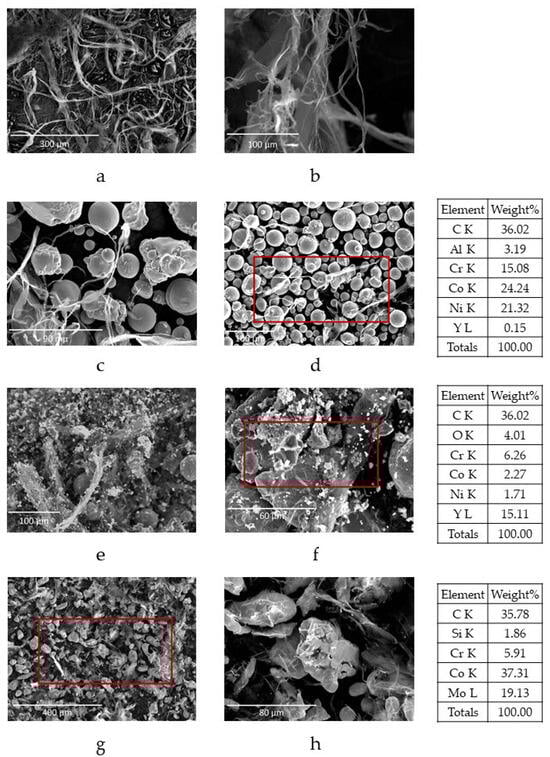 Morphological characteristics of (a,b) SWCNT powder used in feedstock mixtures, (c,d) CoNi alloy with CNT mixture and respective EDS analysis of the area in the red frame, as well as (e,f) CoNi cermet with CNT mixture and respective EDS analysis of the area in the red frame, (g,h) CoMo alloy with CNT mixture and respective EDS analysis of the area in the red frame.
