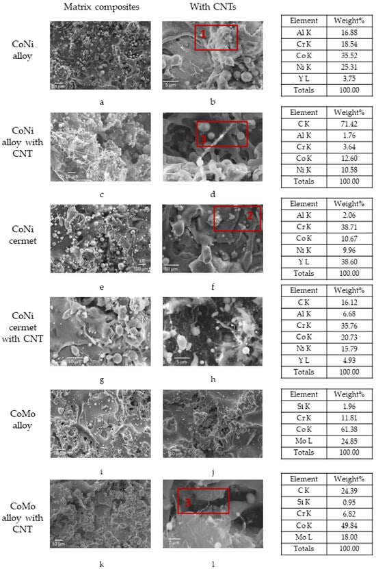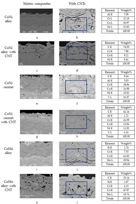 Scanning electron micrographs showing microstructure of the coatings CoNi alloy and respective EDS analysis of the area in the blue frame (a,b), CoNi alloy with CNTs and respective EDS analysis of the area in the blue frame (c,d), CoNi cermet and respective EDS analysis of the area in the blue frame (e,f), CoNi cermet with CNTs and respective EDS analysis of the area in the blue frame (g,h), CoMo alloy and respective EDS analysis of the area in the blue frame (i,j), and CoMo alloy with CNTs and respective EDS analysis of the area in the blue frame (k,l).