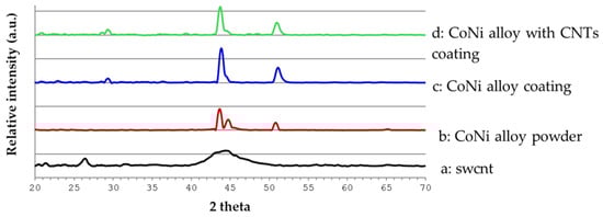 More specifically, the CoNi alloy feedstock powder (Figure 4b) consists of Co5.15Al4.85 (PDF standard peak#46-1012) and Cr2Ni3 (PDF standard peak#65-6291). After deposition as reference coating (Figure 4c), both phases’ main peaks are “combined” in a broader one. No phase changes are observed in the CNT-reinforced coating (Figure 4d).