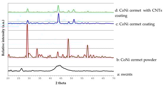 Furthermore, the CoNi cermet multi-phased feedstock powder (Figure 5b) consists of Co5.15Al4.85 (PDF standard peak standard peak#46-1012) and Cr2Ni3 (PDF standard peak#65-6291) attributed to CoNiCrAlY, well crystallized Y2O3 (PDF standard peak#65-3178), and CrB2 (PDF standard peak#34-0369). It is obvious that in both the reference (Figure 5c) and CNT-reinforced (Figure 5d) coatings, the yttrium oxide crystallinity is lower due to the particles flight through the flame and solidification. The broadened CoNiCrAlY peak is present in Figure 5c,d just like in Figure 4c,d.