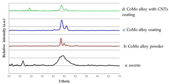The third material investigated in this study, the CoMo alloy (Figure 6b), consists of Ni-Cr-Co-Mo (PDF standard peak#35-1489), Cr5Si3 (PDF standard peak#51-1375), and Co3Mo2Si (PDF standard peak#30-0449) in the form of commercial feedstock powder. In this case, main peak broadening is also observed after deposition no matter whether it is a reference (Figure 6c) or a CNT-reinforced (Figure 6d) coating.