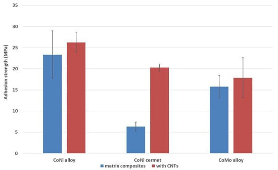 On the other hand, in relation to the multi-phased CoNi cermet and CoNi cermet with CNT coatings that contain lesser cobalt (Co) with a simultaneous absence of molybdenum (Mo) and presence of nickel (Ni) and chromium (Cr) as compared to the above-mentioned coatings, although the average measured bonding strength (Table 2, Figure 8) of the reference coating was significantly lower, in the order of 6.3 MPa, cohesive failure was uniform (Figure 9c). This result can most probably be attributed to the different chemical composition, in combination with the microstructural homogeneity of these coatings. It is worth mentioning that improved dispersion of CNTs in the CoNi cermet coating seems to positively influence their adhesive behavior confirming CNT bridging. The CoNi cermet coating with CNTs demonstrated superior adhesion performance compared to the corresponding metal matrix coating benefiting from improved cohesion between the ceramic and metallic phases due to CNT reinforcement and therefore bridging. As can be seen in Table 2 and Figure 8 and Figure 9d, the adhesion strength of CoNi cermet was increased by 33%.