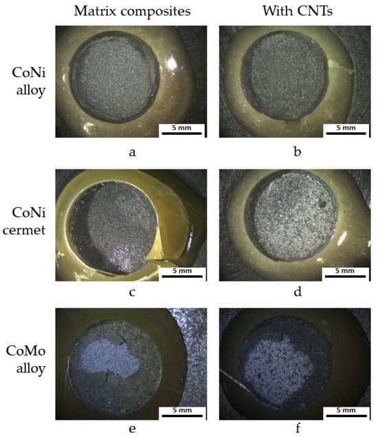 Indicative fracture surface after adhesion test: (a,b) CoNi alloy coating and CoNi alloy coating with CNTs, (c,d) CoNi cermet coating and CoNi cermet coating with CNTs, (e,f) CoMo alloy coating and CoMo alloy coating with CNTs.