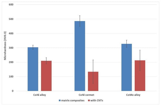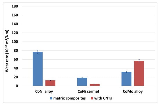 In Figure 12, the specific wear rates of the coatings are shown. In the case of CoNi alloy, wear rate was reduced significantly by the addition of CNTs, in the range of 80%, from 76.96 × 10−5 mm3/Nm to 12.77 × 10−5 mm3/Nm, while CoNi cermet coatings (with and without CNTs), exhibited the lowest wear rate, taking values of 3.89 × 10−5 mm3/Nm and 18.56 × 10−5 mm3/Nm, respectively, also resulting in almost an 80% decrease. In contrast, CoMo alloy coating exhibited the opposite behavior. The addition of CNTs led to an increase in wear rate of about 78%. This is probably due to cohesion deterioration by the inhomogeneous nanotubes’ distribution within the coating mass.
