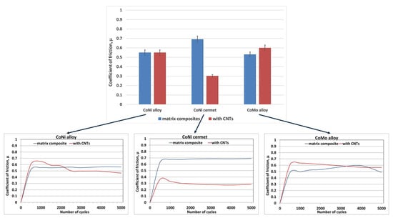 Figure 11 shows a comparative bar diagram of the coefficient of friction for all types of coatings during pin-on-disc measurements. Corresponding COF profiles versus number of cycles are also presented giving a clearer view of the evolution of tribological behavior. At the beginning of the wear process, all coatings undergo a “saturation” stage, during which the contact surfaces adapt to each other, often resulting in an unstable COF increase due to asperity interaction, material transfer, or debris accumulation. As the wear process continues, the coatings enter a “transition” stage, in which the value of the friction coefficient increases slightly. Finally, the wear process becomes stable, and the friction coefficients tend to stabilize without significant variation. CoMo alloy, CoMo alloy with CNTs, CoNi alloy, and CoNi alloy with CNT coatings present an interesting behavior, with sudden changes in the coefficient of friction at the point of approximately 2500 cycles, whereas CoNi cermet and CoNi cermet with CNTs show smoothly varying respective curves.