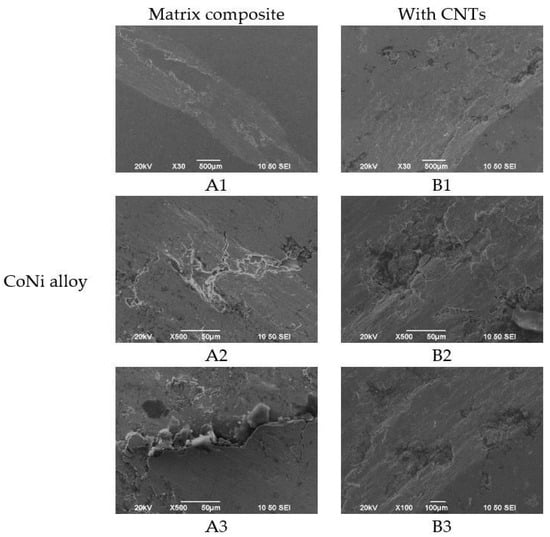 Scanning electron micrographs of the CoNi alloy coating’s wear track surface (A1–A3) and of CNT reinforced CoNi alloy coating’s wear track surface (B1–B3).