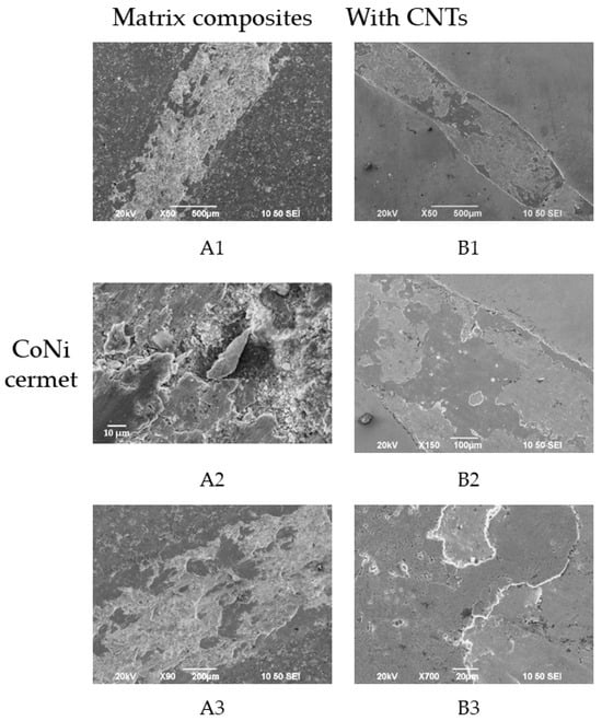 Scanning electron micrographs of the CoNi cermet coating’s wear track surface (A1–A3) and of the CNT reinforced CoNi cermet coating’s wear track surface (B1–B3).