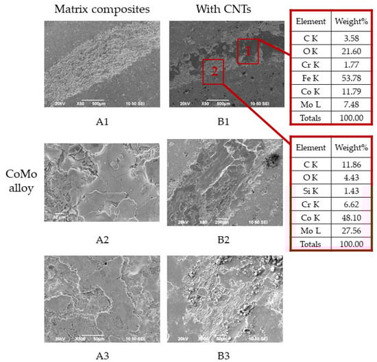 Scanning electron micrographs of the CoMo alloy coating’s wear track surface (A1–A3) and of the CNT reinforced CoMo alloy coating’s wear track surface (B1–B3) with EDS analysis in different areas (area 1, area 2).