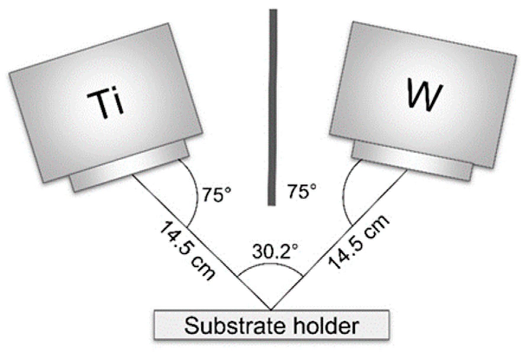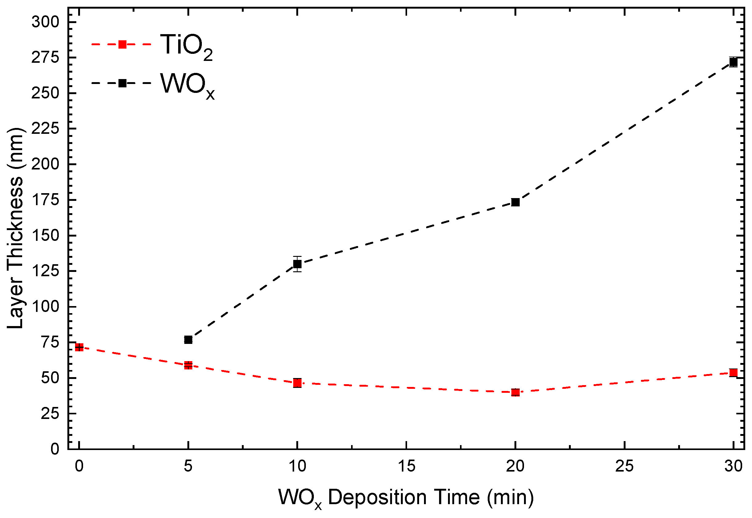 - Dobromir, M.; Apetrei, R.P.; Rebegea, S.; Manole, A.; Nica, V.; Luca, D. Synthesis and characterization of RF sputtered WO3/TiO2 bilayers. Surf. Coat. Technol. 2016, 285, 197–202. [Google Scholar] [CrossRef]