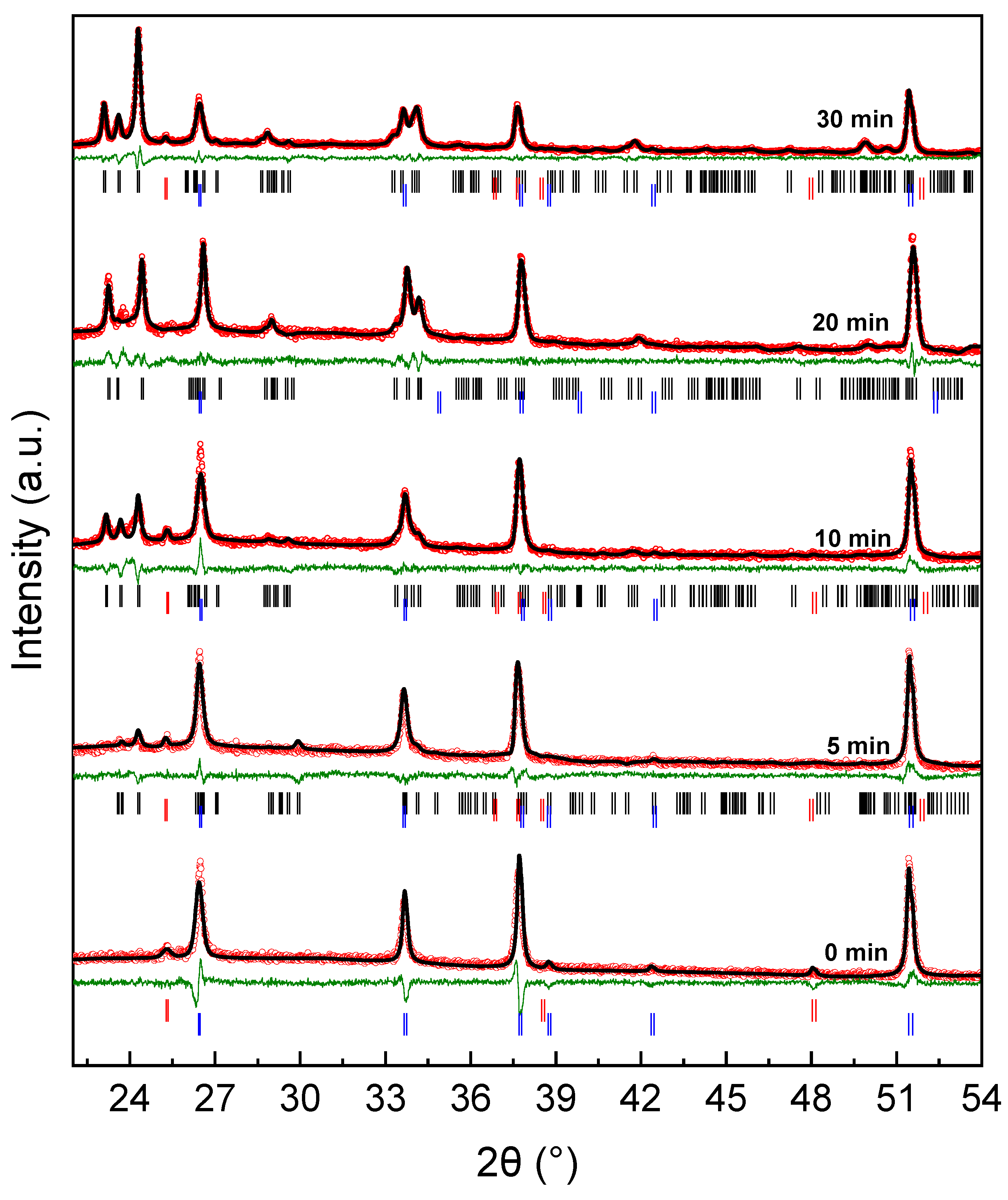 - Rodríguez-Carvajal, J. Recent advances in magnetic structure determination by neutron powder diffraction. Phys. B Condens. Matter 1993, 192, 55–69. [Google Scholar] [CrossRef]