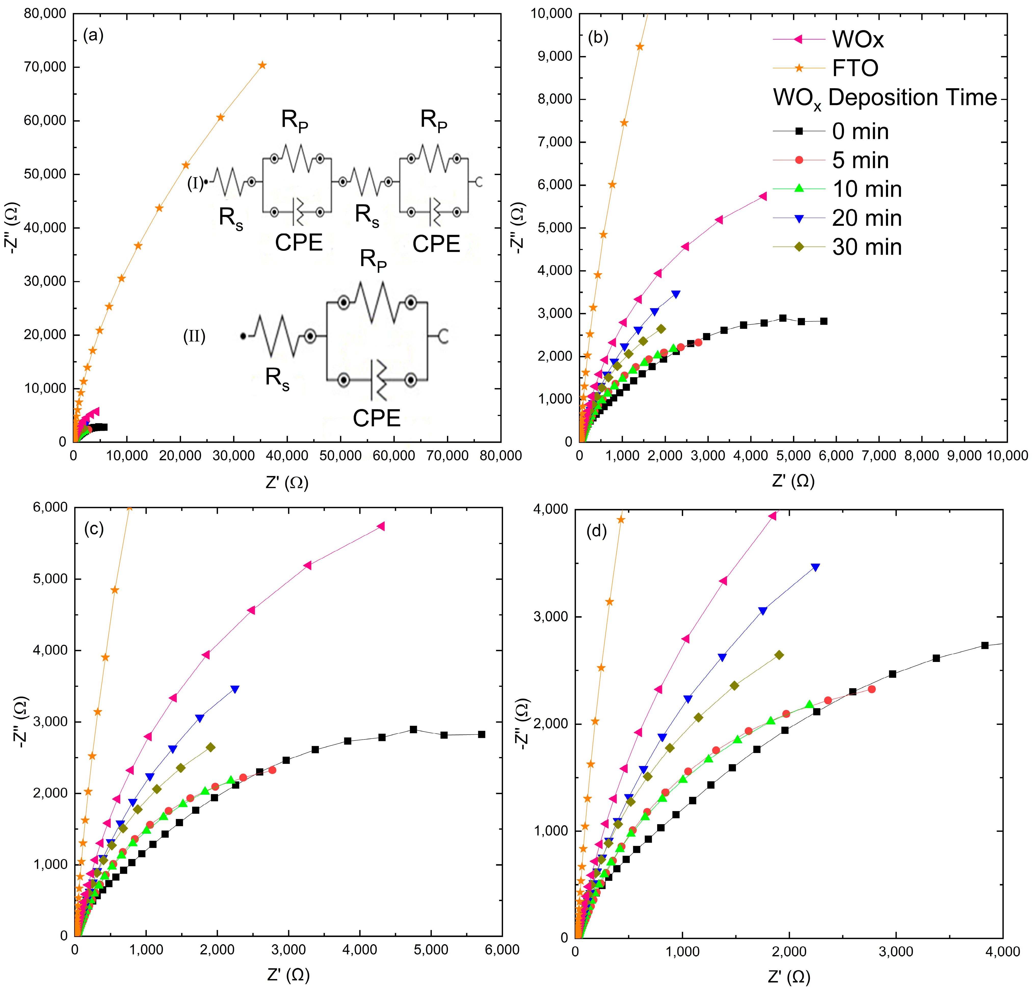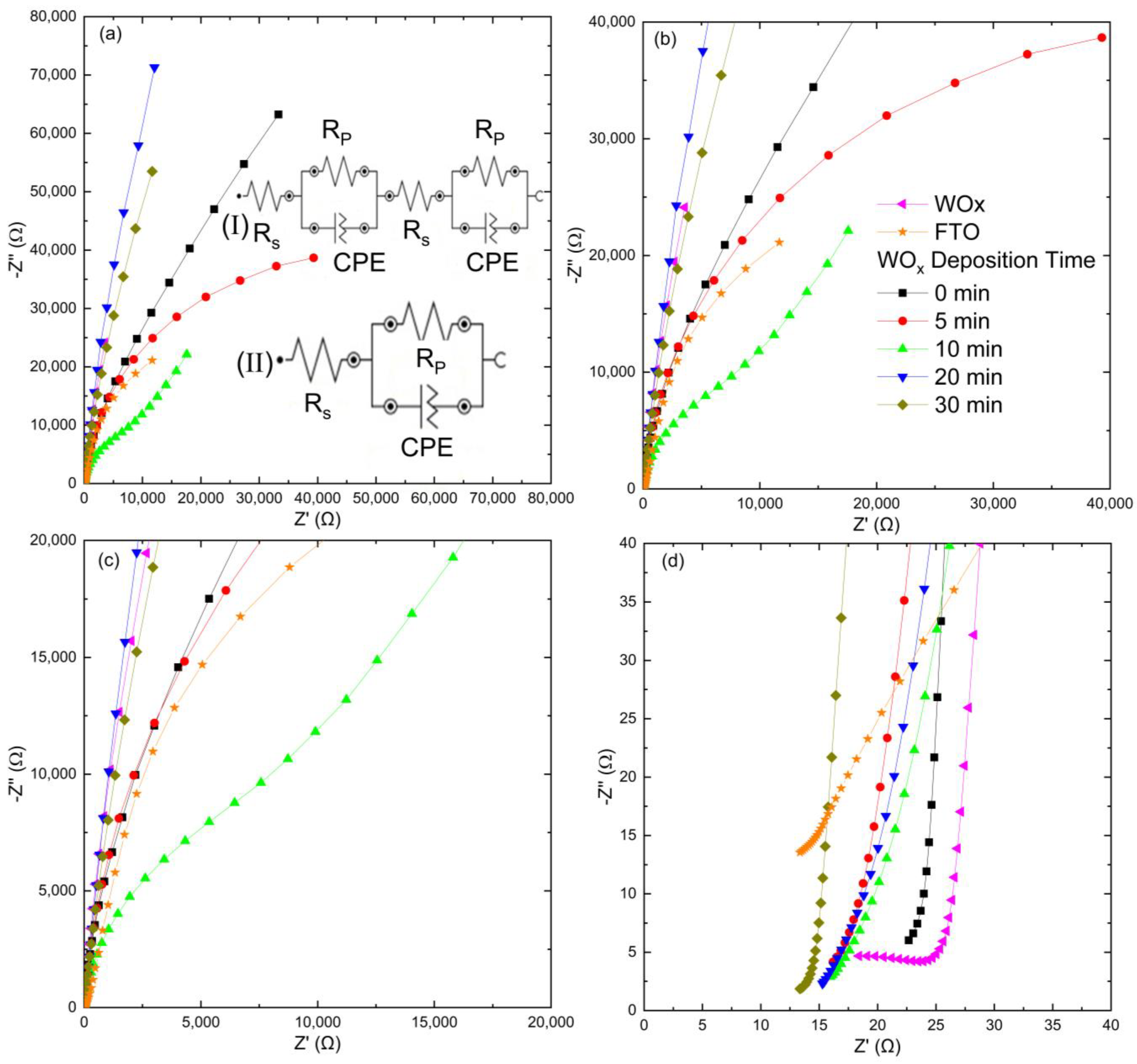 - Rodríguez-Pérez, M.; Rodríguez-Gutiérrez, I.; Vega-Poot, A.; García-Rodríguez, R.; Rodríguez-Gattorno, G.; Oskam, G. Charge transfer and recombination kinetics at WO3 for photoelectrochemical water oxidation. Electrochim. Acta 2017, 258, 900–908. [Google Scholar] [CrossRef]