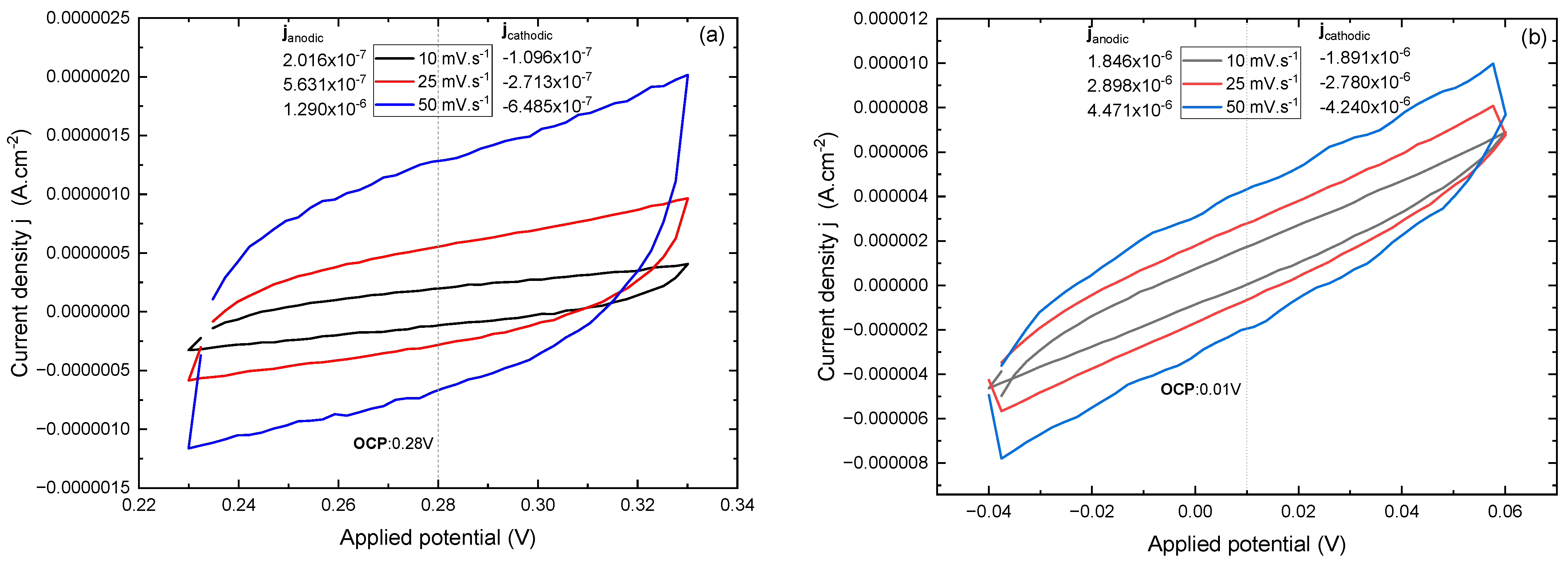3.7. Electrochemical Behavior by Cyclic Voltammetry