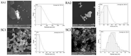 The mean diameter of AgNPs measured from SEM analyses were conducted using the ImageJ (version 1.54d) freeware and reported in the second column of Table 2 [26]. The samples containing no NaBH4 (RA1) or no C6H5Na3O7 (RA2) are found to have large dimensions, around 300 nm, whereas the other ones (SC1, SC2, SC3/SN1, SC4, SC5, SN2, SN3) have quite similar diameters, between 60 and 80 nm. The uniformity in size of the AgNPs is depicted from the widths at FHWM of the size-distribution histograms. The values reported in the third column of Table 2 reveal an acceptable homogeneity in the size of AgNPs in the SC and SN sample series, with standard deviations between 10 and 15% around the average diameter of the nanoparticles. The small variations in the AgNPs dimensions are attributed to the use of different AgNO3:C6H5Na3O7:NaBH4 molar ratios [3,27].