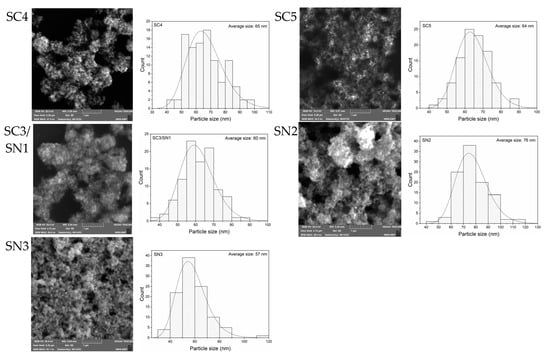 The data recorded by DLS are given in the fourth, fifth and sixth columns of Table 2, each referring to the size of AgNPs, and the PDI and zeta potential associated with their uniformity in size, respectively. Figures of particle size distributions are in the Supplementary Material. These values are in agreement with those obtained from our SEM analyses. For PDI ≤ 0.1, the colloidal solution is considered as highly monodisperse; between 0.1 and 0.4, it is moderately polydisperse; and above 0.4, it is identified as highly polydisperse [28]. This result confirms that SC and SN sample series of the AgNPs synthesized through the implemented chemical recipes of Table 1 have homogeneous dimensions fluctuating between 50 and 100 nm.