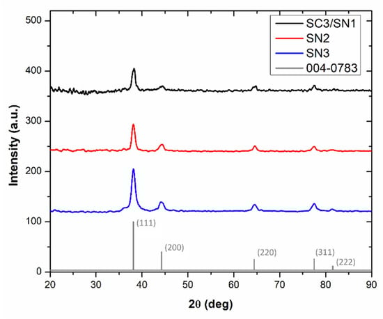 The composition and crystallinity of the AgNPs have been investigated by XRD and EDS analyses. Such characterization techniques can also be relevant for the detection of contaminants, as well as the presence of residues coming from incomplete chemical reactions, for this reason this section considers the SN series only. In Figure 2, the diffraction patterns of the SN series samples are shown and compared to the tabulated data of Ag. The spectra exhibit diffraction peaks at 38°, 44°, 64°, 77° and 81° corresponding to the Ag planes labeled (111), (200), (220), (311) and (222), respectively. These reflections correspond to the crystalline structure of silver face-centered cubic (fcc) symmetry [35,36,37]. No other peaks related to impurities or residues were observed, suggesting negligible sample contamination. By comparing the data, it is observed that the increase of AgNO3 concentration increases the intensity of the Ag diffraction peaks, indicating the occurrence of a more efficient reduction in Ag+ for AgNPs prepared with the highest AgNO3 content. The thinning of these diffraction peaks also suggests that the formed AgNPs have a higher crystallinity in SN3.