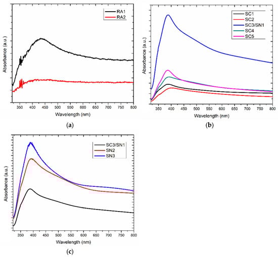 UV-Vis spectra of the AgNPs formed in the RA (a), SC (b) and SN (c) samples series, respectively.