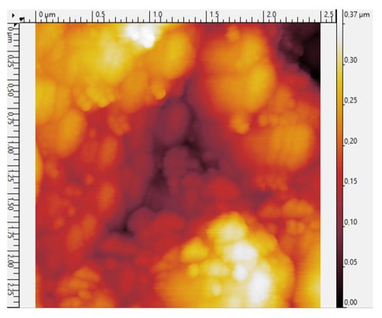 The surface roughness and layer compactness of the SN3 sample were investigated by AFM. As illustrated on the surface mapping of Figure 5, the topography of the layer formed by the deposited AgNPs is relatively uniform, showing surface roughness of the 2.5 × 2.5 µm2 AFM profile. The root mean square (Rq) and the average roughness (Ra) values are found to be 65 nm and 53 nm, respectively. It is also observed that most of the AgNPs are in contact with each other, suggesting efficient current conduction through percolation.