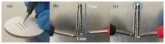 Satisfactory preparation conditions resulting in ohmic contact for silver nanoparticles of conductive sample SN3 were tested on other substrates such as filter paper. To this end, these AgNPs were deposited onto filter paper using a conventional fountain pen [79], and a basic circuit was realized by handwriting. Perpendicular lines were drawn and (Figure 9a) dried at RT in ambient air. The electrical resistance of these wires was measured to be 10.18 Ω. Two 5 cm long traces were connected to an LED (Figure 9b), which was then successfully switched on and off, as shown in the image in Figure 9c, where the blue circle indicates the emitted white light. Moreover, to test the performance of printed tracks in photographic paper, a basic circuit was fabricated by adding a resistor and using the same previous conditions, as shown Figure 10. The circuit successfully turns on the LED device after being folded and under bending.