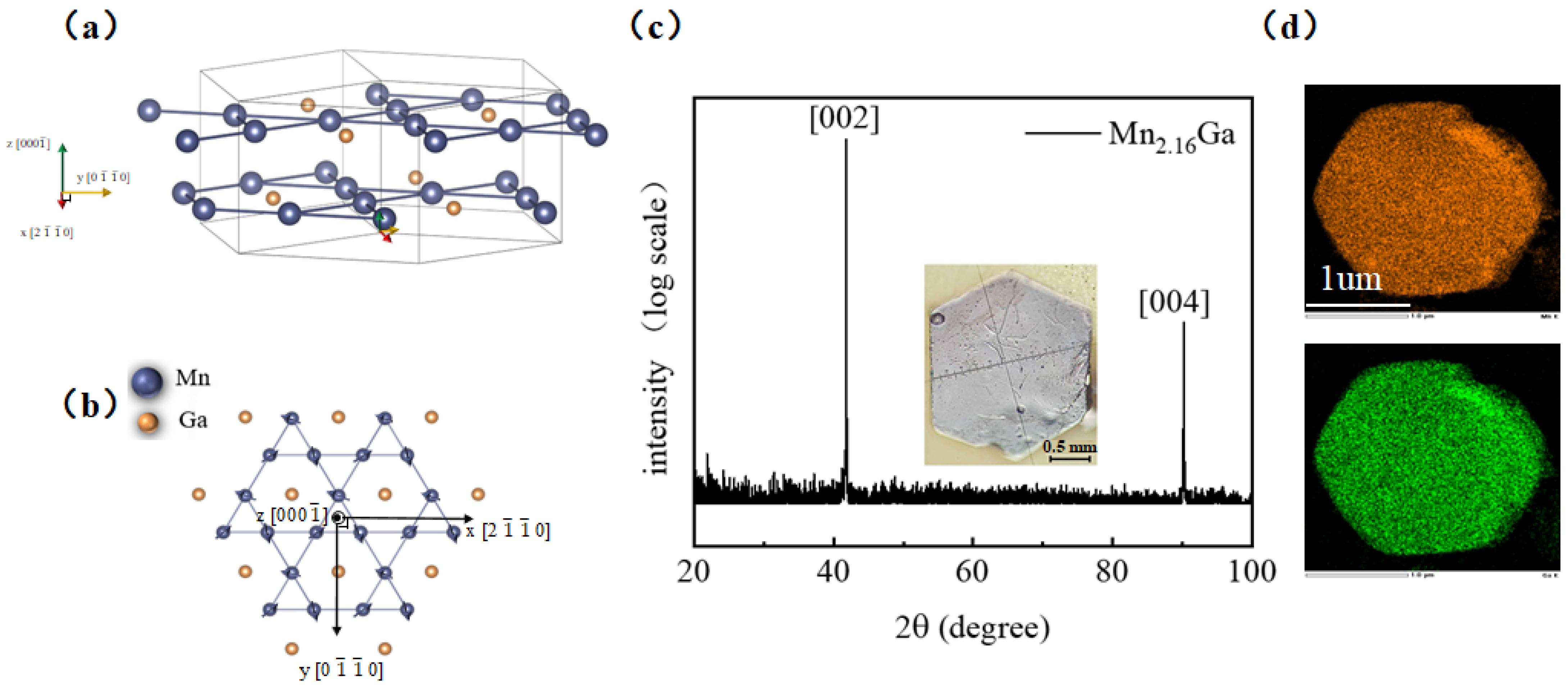 32]. EDX mapping of a hexagonal single-crystal particle (~1 μm in side length) confirms the uniform distribution of Mn and Ga without elemental segregation, indicating high compositional homogeneity and crystal quality (