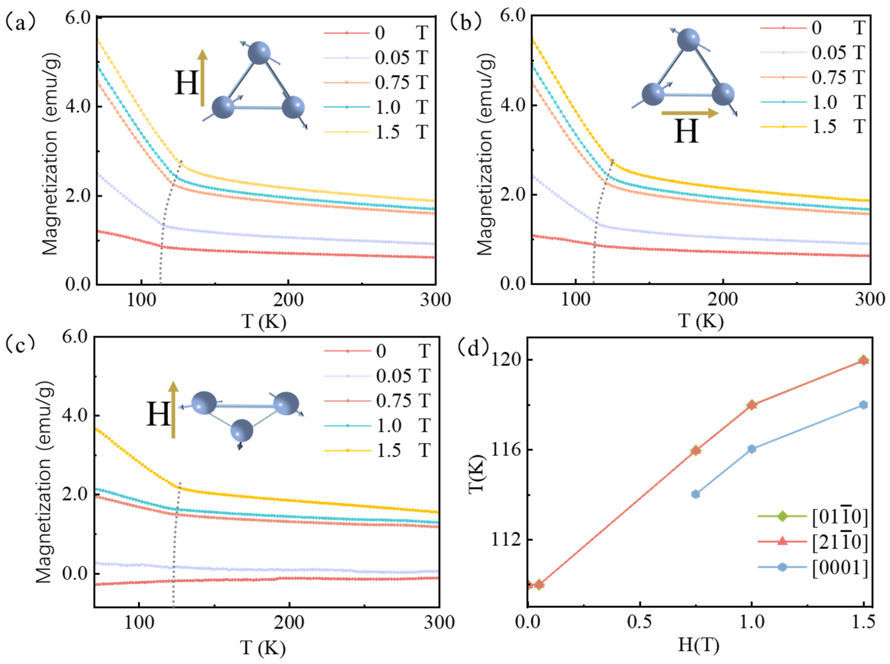 0] orientation as an example: under 1.5 T, the inflection occurs at 125 K; as the field decreases to 0.05 T, it shifts down to 116 K, demonstrating a clear field dependence. Below the inflection temperature, the magnetic moment decreases rapidly with increasing temperature, whereas above it, the decrease becomes significantly more gradual. This contrasts with smooth order-to-disorder transitions in conventional magnets and indicates a temperature-induced change in magnetic structure (kagome lattice distortion) within the 110–130 K range. The systematic shift of the transition temperature with field confirms that this distortion is modulated by both temperature and the magnetic field.