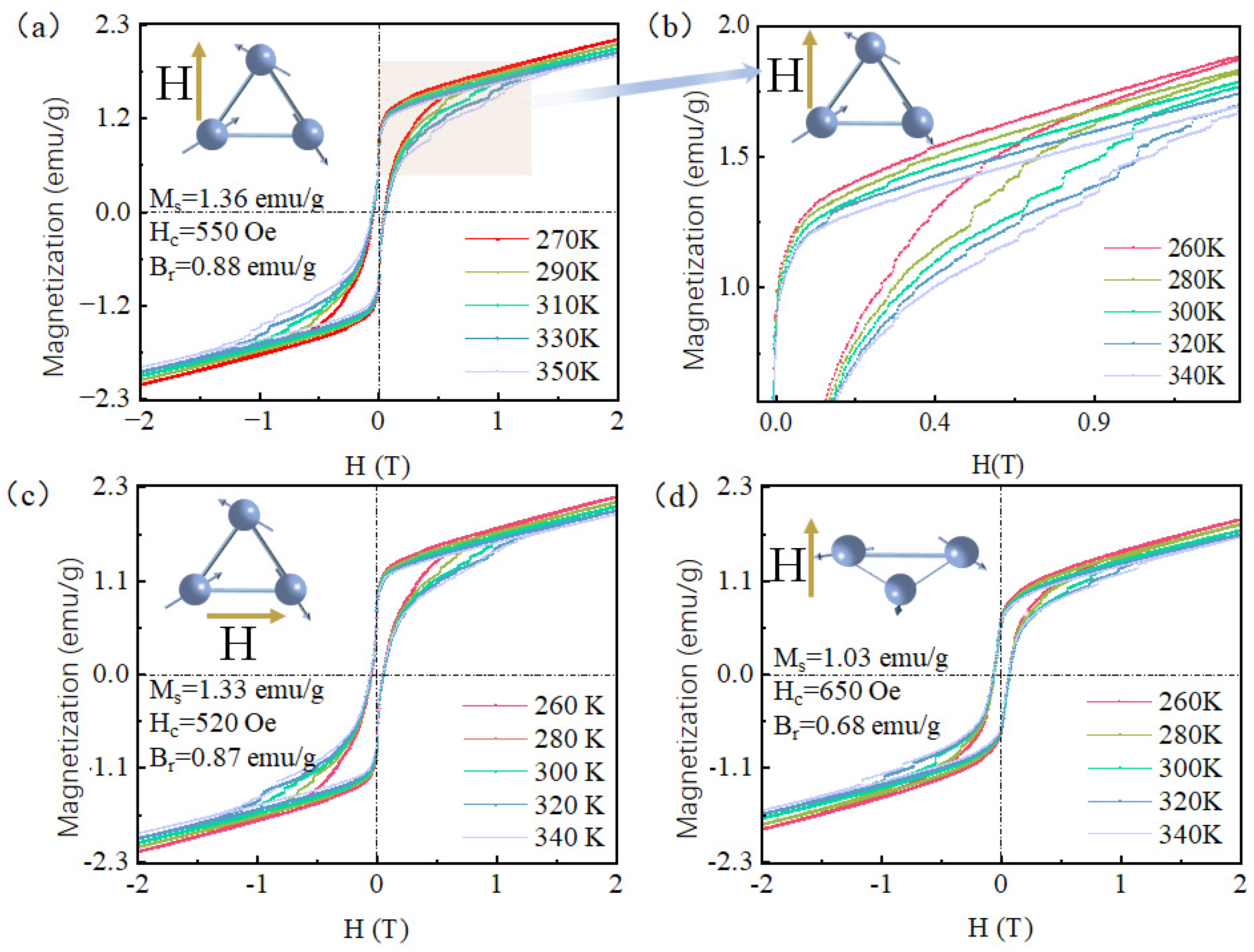 Figure 3, magnetic hysteresis loops of the sample were measured at five discrete temperatures—70 K, 125 K, 200 K, 300 K, and 340 K—within the range of 70–340 K; the results are shown in