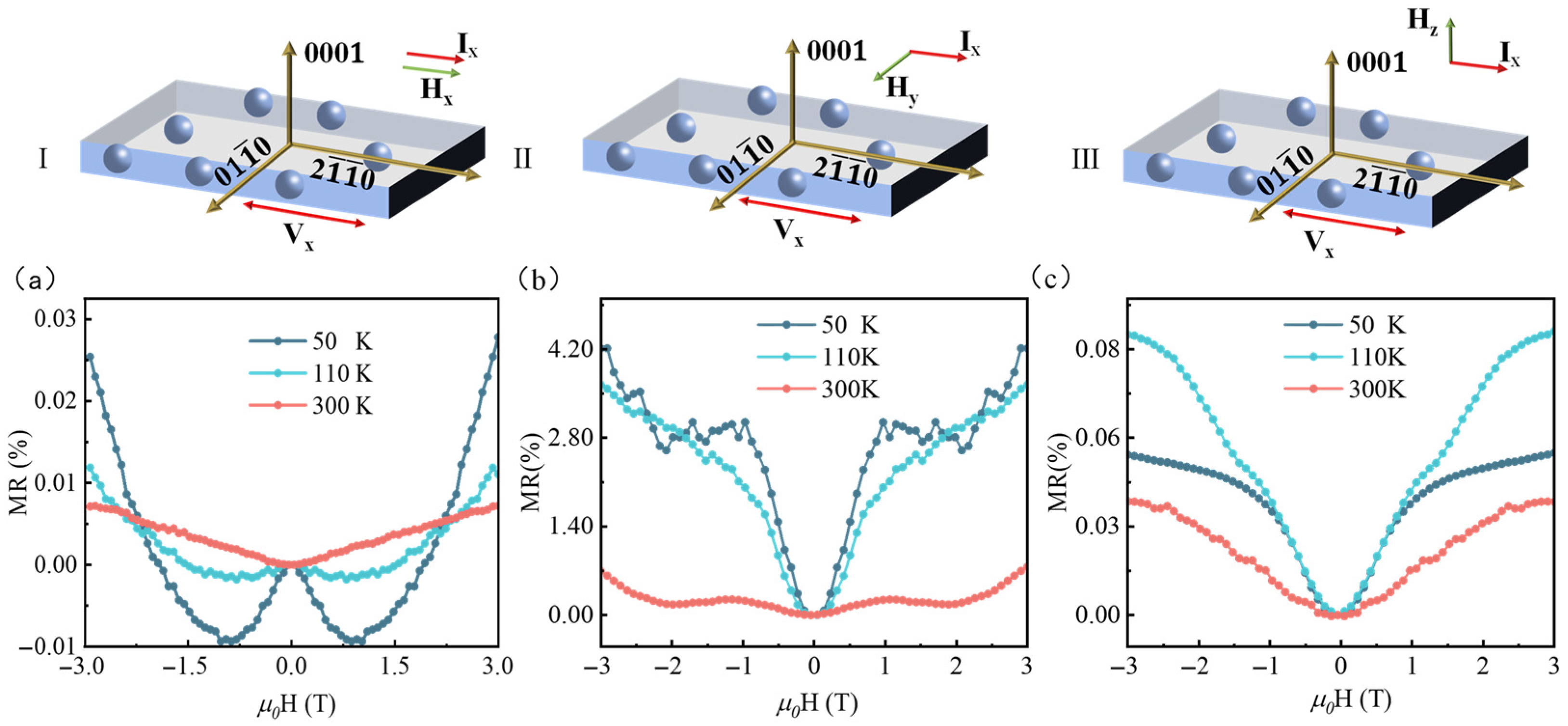 Figure 5 presents the MR results measured at 50 K, 70 K, 110 K, and 300 K, respectively, under various current and field orientations. As shown in