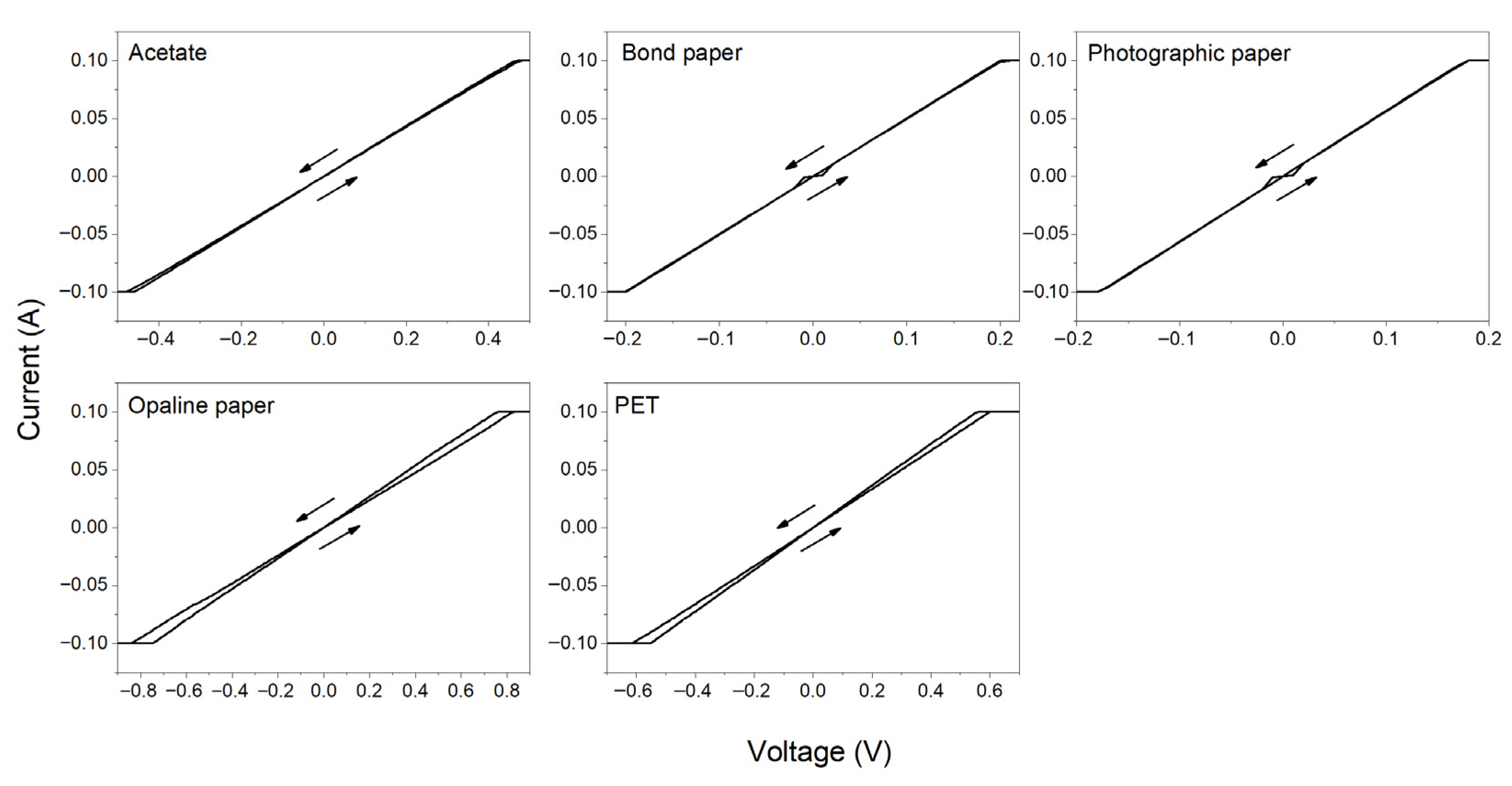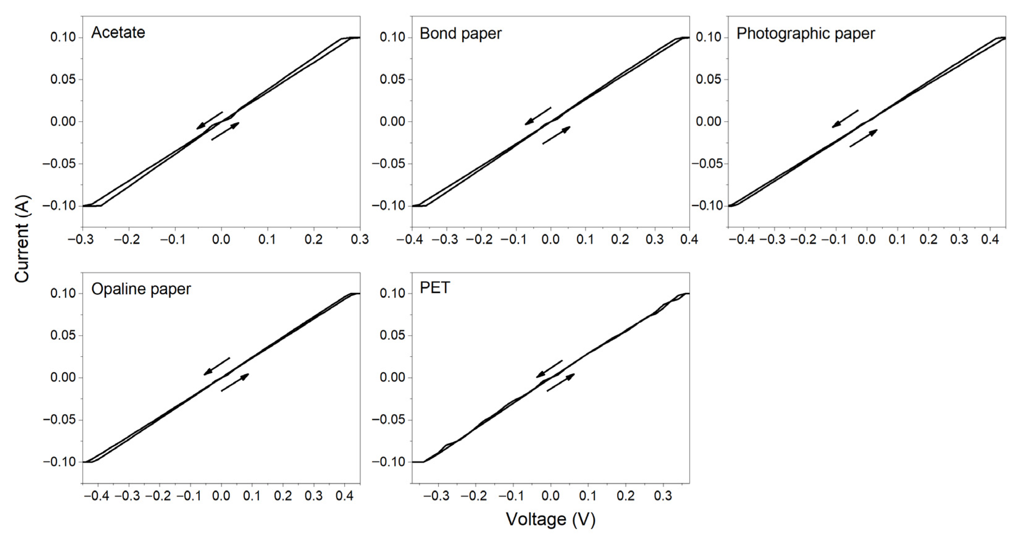 - Dominguez, M.; Sosa, J. Copper phthalocyanine buffer interlayer film incorporated in paper substrates for printed circuit boards and dielectric applications in flexible electronics. Solid State Electron. 2020, 172, 107898. [Google Scholar] [CrossRef]