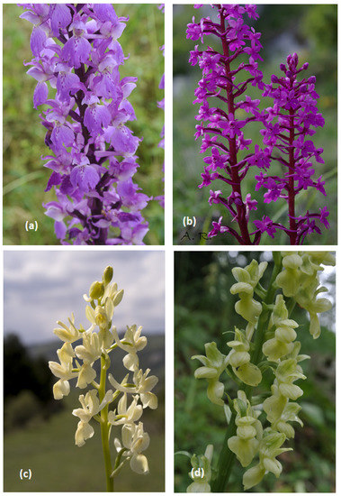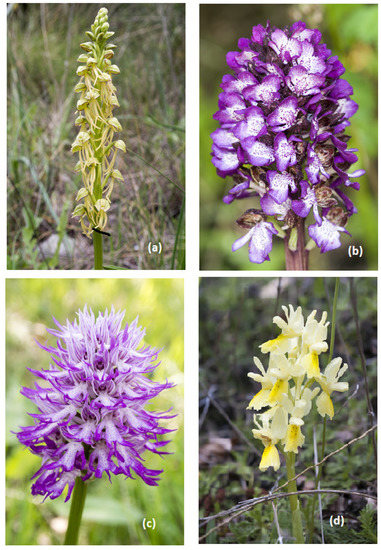 (a) Orchis mascula; (b) Orchis quadripunctata; (c) Orchis provincialis; (d) Orchis pallens. Photos of V. A. Romano.