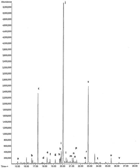 Chromatogram of volatile organic compounds from Orchis anthropophora: (a) tridecane; (b) tetradecane; (c) caryophyllene; (d) humulene; (e) pentadecane; (f) tridecanal; (g) 1-(1-methylethyl)-5-methyl-1,2,3,4-tetrahydronaphthalene; (h) 2-allyl-4-methylphenol; (k) ethyl dodecanoate; (i) hexadecane; (j) tetradecanal; (l) megastigmatrienone; (m) 4-(1-methylethyl)-1,6-dimethyl-1,2,3,4-tetrahydronaphthalene; (n) heptadecane; (o) pristane; (p) pentadecanal; (q) ethyl tetradecanoate; (r) octadecane; (s) hexadecanal; (t) nonadecane; (u) isopropyl palmitate; (v) heneicosane.
